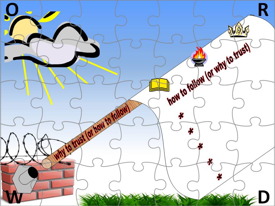 W – Warped World of God’s People – The brick wall and barbed wire symbolize what we read in Galatians 3:19-24. We are slaves to sin and helpless on our own. The image reminds us of our task to identify the specific aspect of sin (ours or others that does or should involve us) that is being addressed in the text.