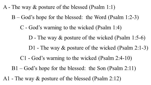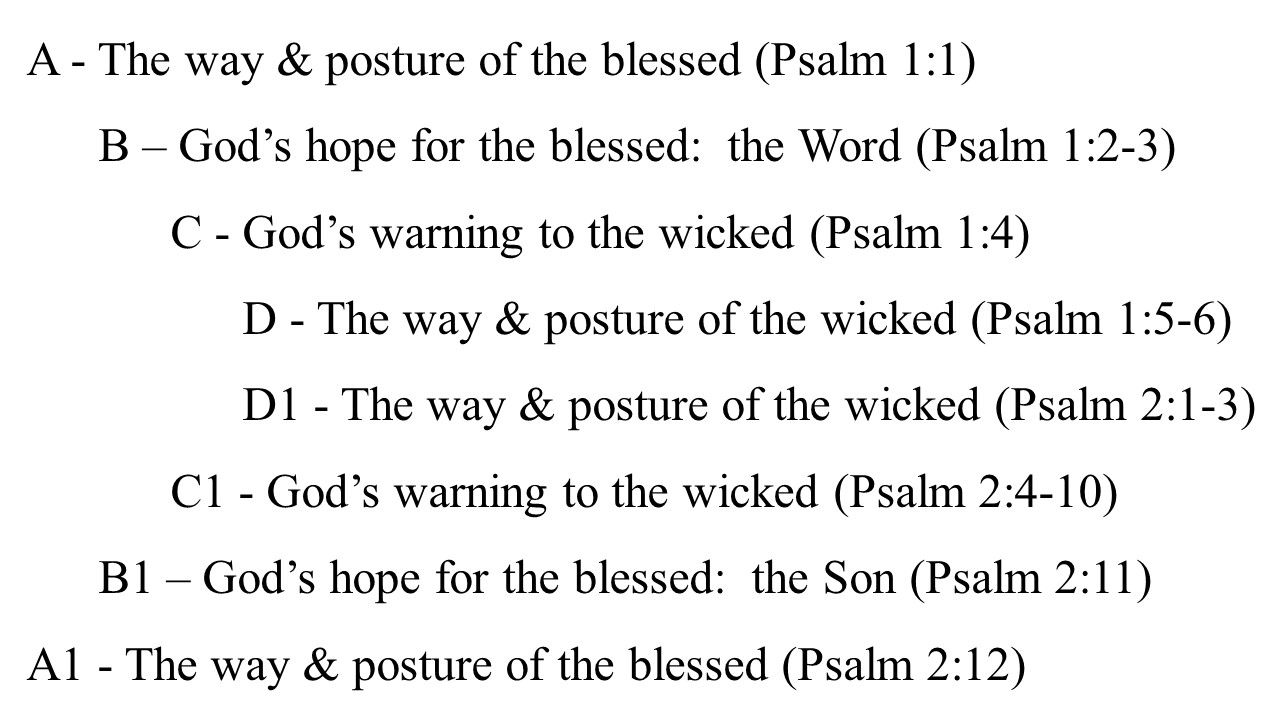 Notice, for example the emotion of fear in Psalm 1 and 2. Although these are two separate Psalms, they seem to form a rough literary chiasm. “Chiasm” refers to appearance of the Greek letter “Chi” (our X) because the literary passage in question pictures repeated themes that focus toward its center. Psalm 1 and 2 also serve as an introduction to the emotional roller coaster of all the Psalms because of their single emphasis in two parts of the chiasm: warning us against rebellion and calling us to faith and obedience to His Word and His Son. Note, too, that the emotion of fear, implicit and explicit, are depicted by physical ways (actions) and postures.