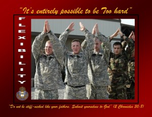 Divisions are like humongous versions of the human body: they need their parts to act powerfully and precisely to do anything the “Head‟ calls them to do ASAP. That’s a good working definition for flexibility: being able to turn on a dime, especially in the face of danger. If your body suddenly Photo courtesy of U.S. Army encounters danger and is not flexible, the parts of your body could easily be injured. And, as you can imagine, greater danger and less flexibility increases the risks. But I was “stiffnecked” and didn’t want to turn from my preferred routines.